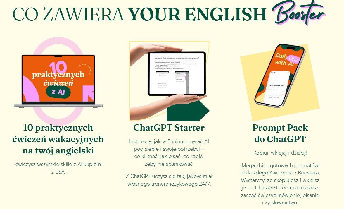 Naucz się, jak mówić płynniej, pisać lepiej, rozumieć więcej w 20 minut każdego dnia z AI, dzięki gotowym pomysłom na niepodręcznikowe ćwiczenia i poleceniom kopiuj – wklej do chata GPT